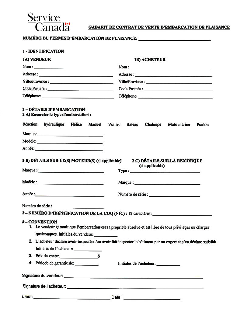 Transférer un permis d'embarcation de plaisance. Formulaire nº 84-0172F - Demande de permis d'embarcation de plaisance - Québec. Pour une embarcation de plaisance dont le moteur est de 10cv et plus, le permis d'embarcation de plaisance est obligatoire. Le permis d'embarcation de plaisance est gratuit et est valide pour dix ans.
