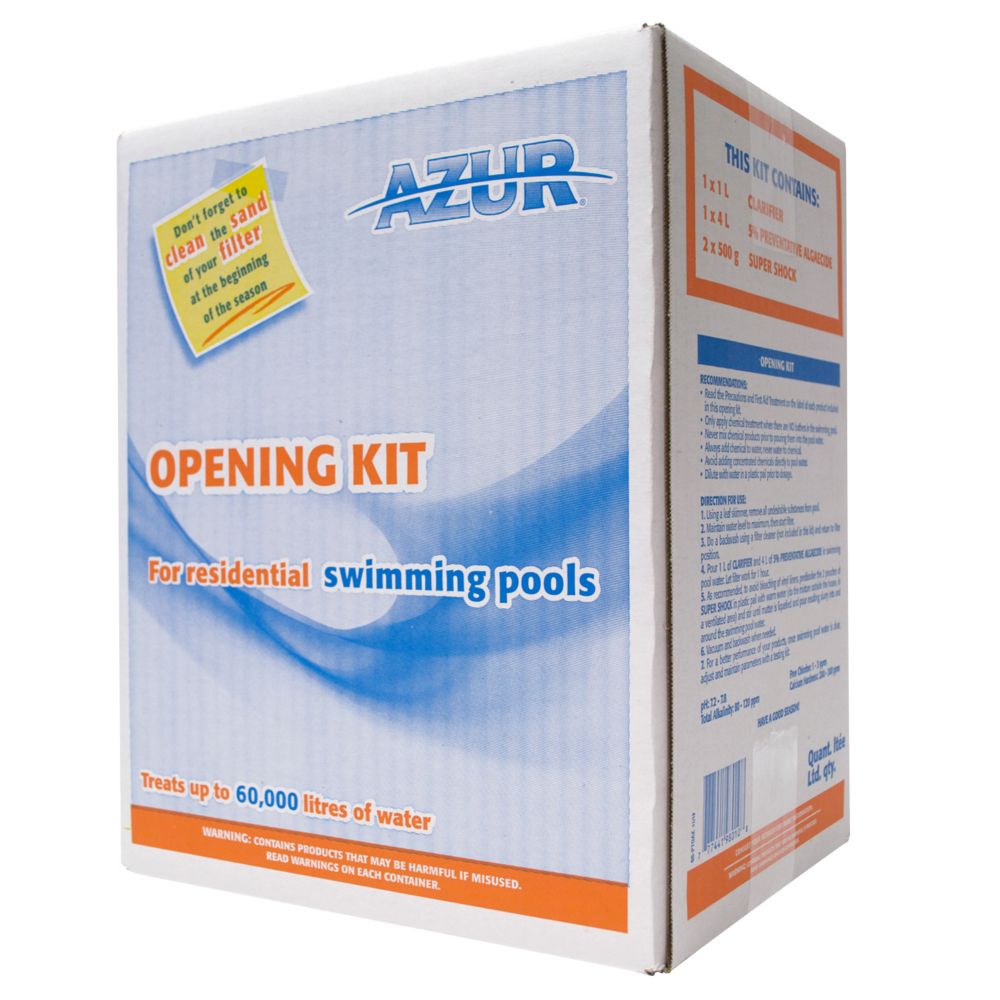 Description. Cette trousse a été conçue pour vous permettre d effectuer facilement et efficacement l ouverture de votre piscine et d ainsi débuter la saison de baignade du bon pied. Seulement 48 heures après l application des produits, vous retrouverez une eau claire. Idéal pour les piscines de moins de 50 000 litres d'eau.